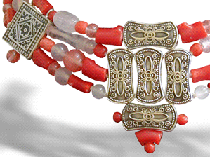 Koralle, Rosenquarz und antike Silberelemente sind die Komponenten dieses Schmuckstückes. Die Farbschattierungen der Steine verleihen diesem vom Beduinenschmuck inspirierten Collier einen zusätzlichen Reiz.