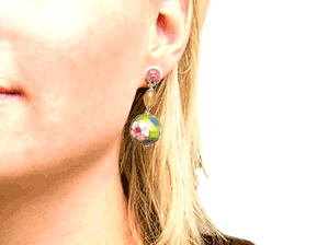 ruby, enamel, rose quartz, serpentine, gold, silver This multi-colored cocktail earring was inspired by a trip to Thailand.