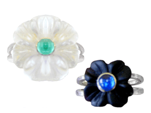 The gold closed-set cabochon in the center is attached to a screw-device that fastens the flower-shaped stone to the silver hoop.
