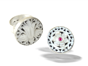 Pierced, carved and closed-set in silver against an oxidized background, the mother of pearl discs display floral motifs inspired by Islamic ornamentation.