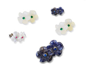Die handgeschnitzten Edelsteine in Blumenform sind mit einem Cabochon geschliffenen Stein, der austauschbar ist, verziert.