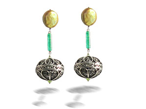 Ein durchscheinender länglicher Avanturin verbindet die filigrane Silberkugel mit einer goldenen Barockperle.