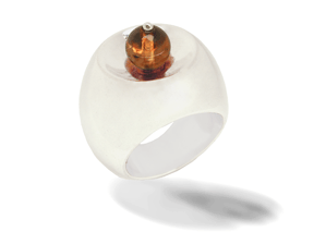 Die konkave und spiegelnde Oberfläche lässt die Bernsteinperle je nach Blickwinkel in ihren Dimensionen anders erscheinen: eine optische Illusion.