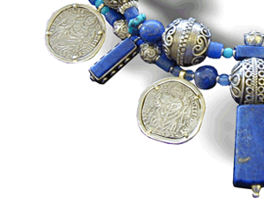lapislazuli, turquoise, glass and silver beads, onyx, antique silver coins, gold, silver