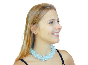 The blue glass chips are assembled in clusters and then stringed to achieve a maximum play of colour. The silver barrel clasp set with a sapphire compliments the design.
