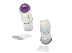 Tubular cases for tampons in sterling silver set at one end with a cabochon-cut amethyst or moonstone, made for the handbag as Nécessaire articles.